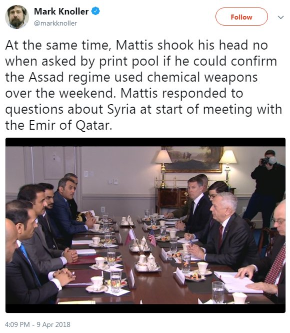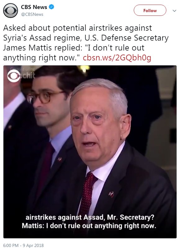 Nowhere in the article does CBS mention that Mattis couldn't confirm to their correspondent that the Syrian army used chemical weapons. Minor detail. pic.twitter.com/5NNGkfTbOn