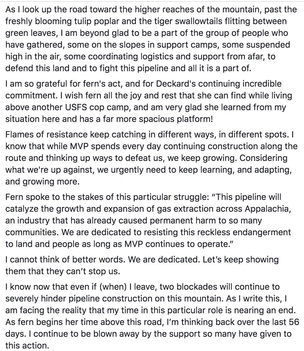 #noMVP Update: As another protester climbed up the skies yesterday in Virginia's Jefferson National Forest 2 stop Mountain Valley Pipeline from barreling through Appalachian Trail, "Nutty," a protester up in the skies of the forest SINCE MARCH 27th applauds #StandWithNuttypic.twitter.com/HqMJZmwzNO
