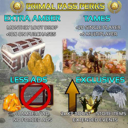 Primal Pass now comes with a host of new perks. Subscribers enjoy monthly loot drops, additional tame slots, bonus Amber, access to exclusive items, and more!