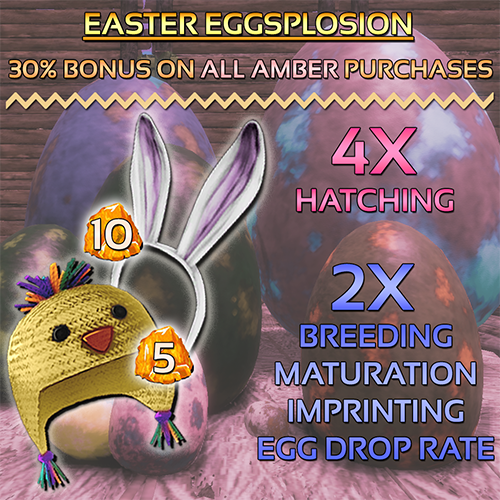 Our Easter Eggsplosion weekend kicks off tomorrow at 3pm EST. Enjoy a 30% bonus on all Amber purchases, deep discounts on the Bunny Ears & Easter Chick skins, and boosted breeding rates including 4x Egg Hatching and for the first time ever in #ARKmobile - 2x Egg Drop Rate!pic.twitter.com/icvovXTLTb