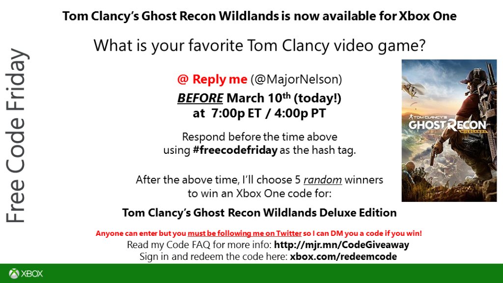 #FreeCodeFriday time. Read this and you could win a code for Tom Clancy’s Ghost Recon Wildlands - Deluxe Edition on Xbox One. Good luck.pic.twitter.com/ssCKaOxRF1