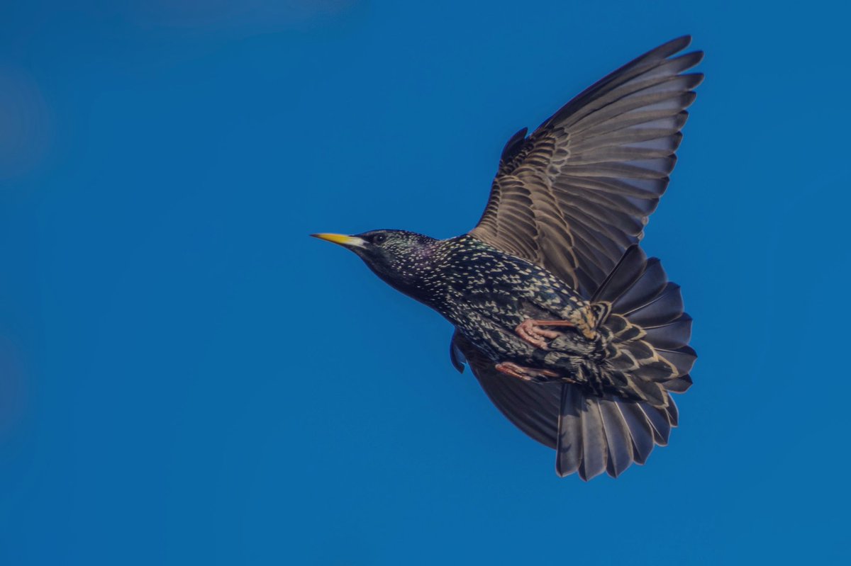 I like the crisp , Winter azure sky, the composition , the power of flight and the real beautiful colour of starlings . It has all the hallmarks of take off and its a great , sharp image.https://twitter.com/JordanNaturePht/status/1211947160520024069 …
