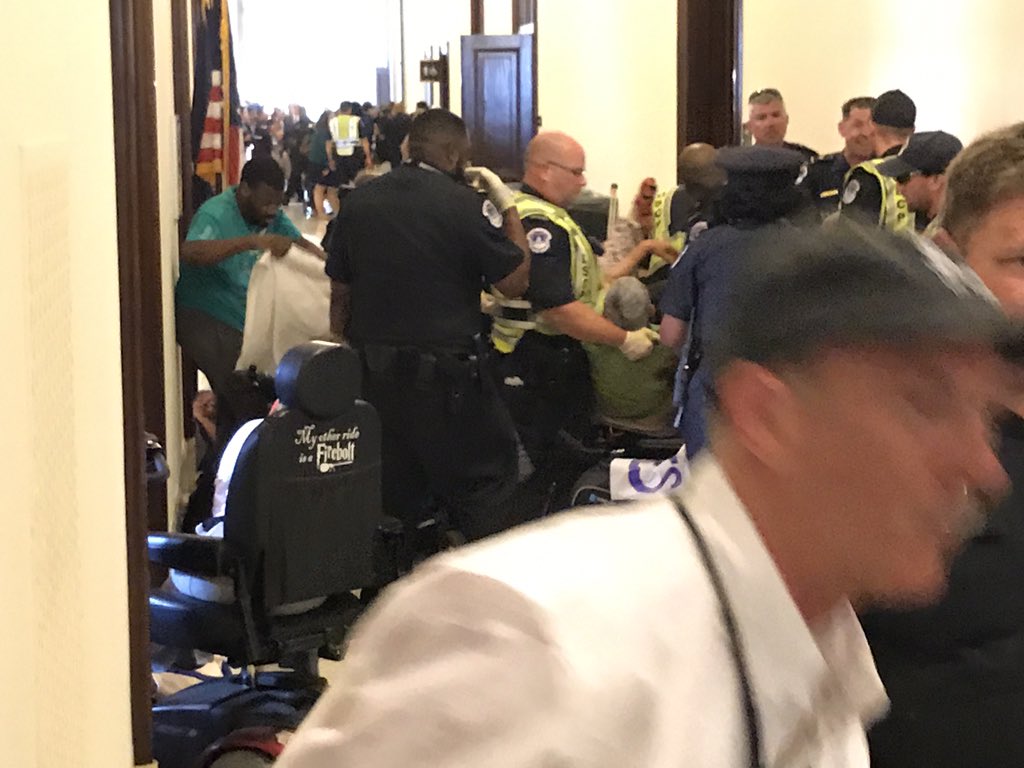 A few protesters remain at @SenateMajLdr's office. Over 50 were arrested, some were dragged out of their wheelchairs. #StopTrumpcarepic.twitter.com/dddy4Q3rpg