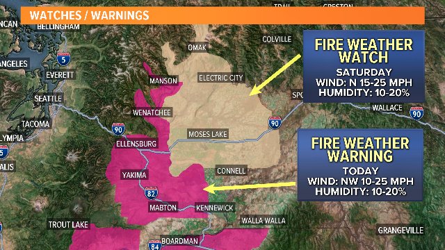 FIRST ALERT: A Fire Weather Warning is in effect today for the areas in pink. A Fire Weather Watch will be in effect tomorrow for the areas in tan.