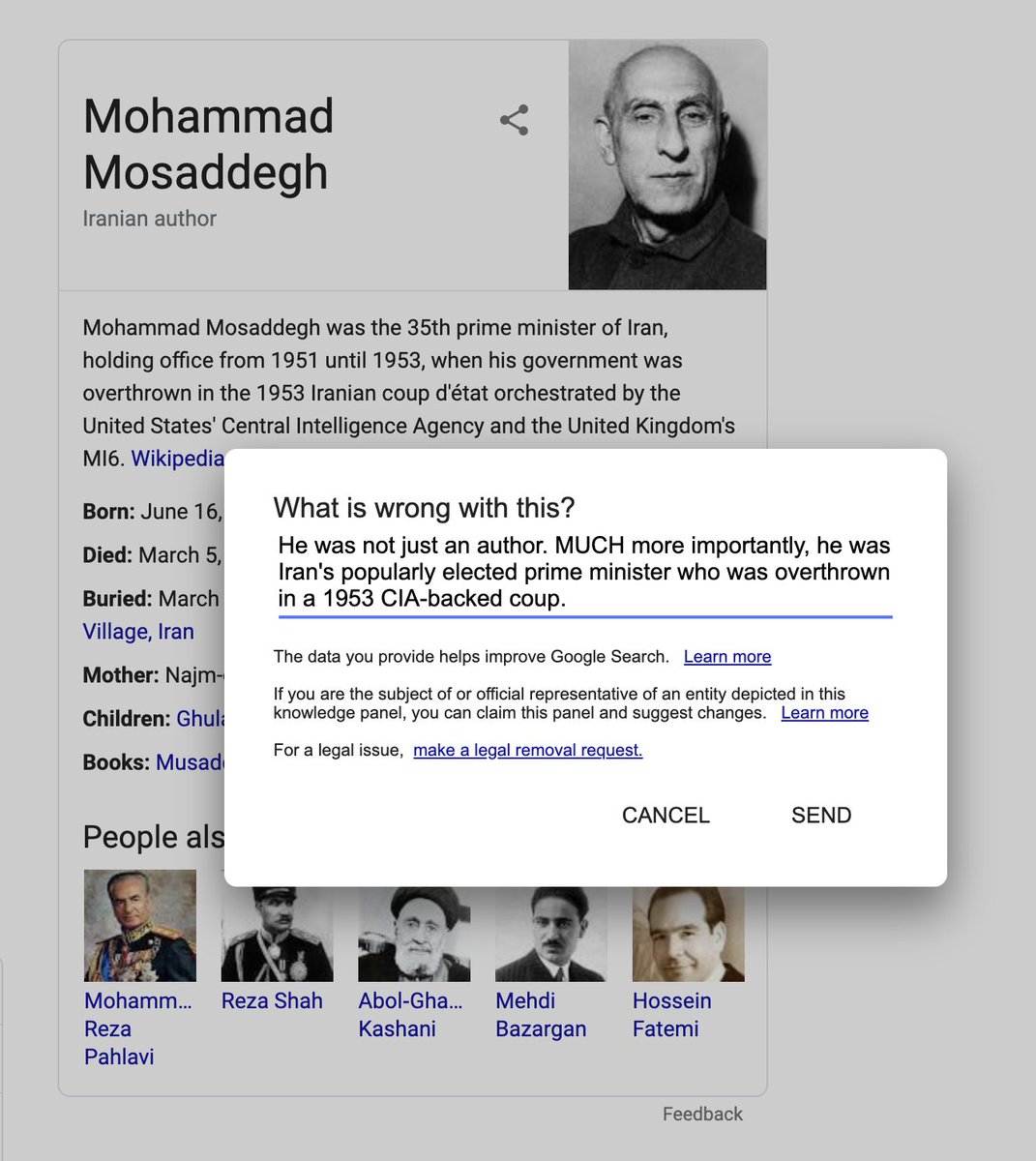 @Google. Mohammad Mossadegh was not just an "author." He was Iran's popularly elected prime minister who was overthrown in a CIA-backed coup in 1953. Can you fix?pic.twitter.com/UIXRE4Wyja