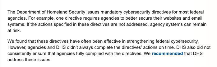 @CISAgov's (relatively new) authority to mandate civilian agencies make cybersecurity fixes. The only big problem: Agencies aren't following orders fast enough. https://www.gao.gov/products/GAO-20-133?utm_campaign=usgao_email&utm_content=daybook&utm_medium=email&utm_source=govdelivery …pic.twitter.com/jv69Ae5S3j