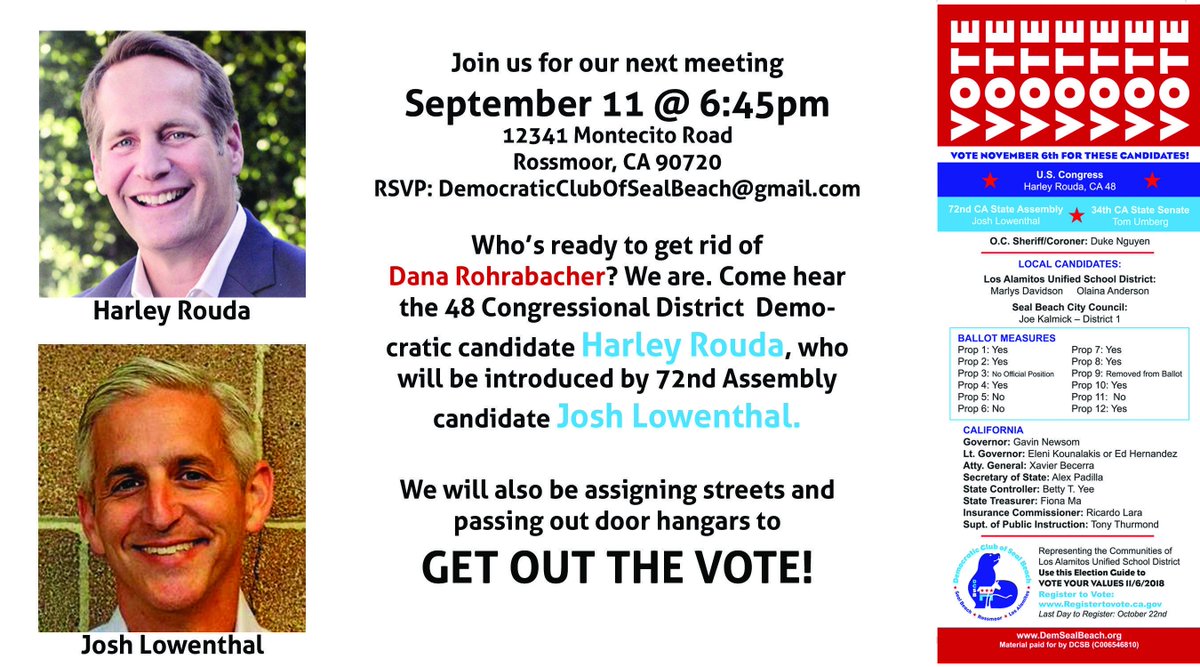 Join me tomorrow evening at the @Dems_SealBeach monthly meeting with @HarleyRouda at 6:45 PM. RSPV here: https://buff.ly/2wVZPx9 pic.twitter.com/FuRSNykZ4P