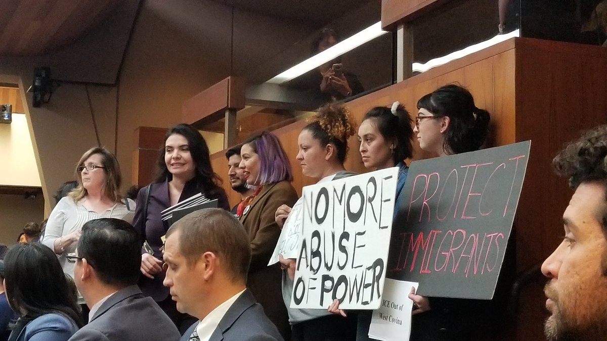 SB54 supporters hold signs in the back of the West Covina council chambers.pic.twitter.com/vY5jJDAJO7