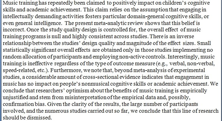 Meta-analysis: "The impact of music training on cognitive and academic skills is null." https://psyarxiv.com/7s8wr/ pic.twitter.com/km36EunErw