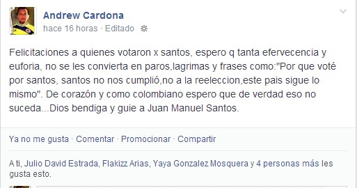 @JuanManSantos a su causa x la paz nos unimos muchos colombianos sin importar nuetras ideologías, a ud le qda es respondernos con hechos