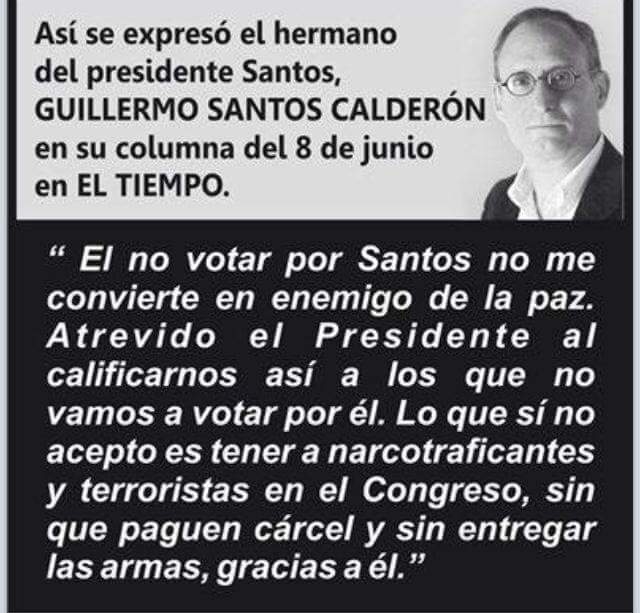 @JuanManSantos callese no mas paz estamos cansados ya de oír esa paz paz los colombianos no lo apoyaron en las urnas no creen en esa falsa
