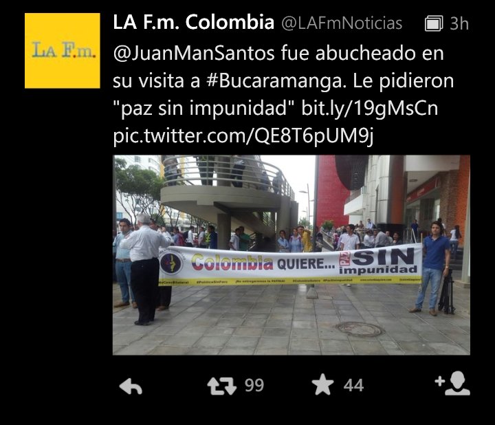 @JuanManSantos Quien dijo que alguien quiere la guerra ,queremos La Paz pero con justicia si rendición al terrorismo no sea tan cómodoThanks. Twitter will use this to make your timeline better. UndoUndo