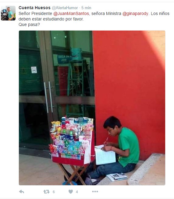 @JuanManSantos ORGULLO!? Sienta orgullo x los niños q estudian en #Colombia, los alimentan con migajas y sus padres viven con un mínimo.