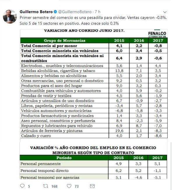 Esto dice el presidente de @FenalcoNacional... ventas cayeron -0.8%. Solo 5 de 15 sectores en positivo.pic.twitter.com/lBLJfZ7Xrg