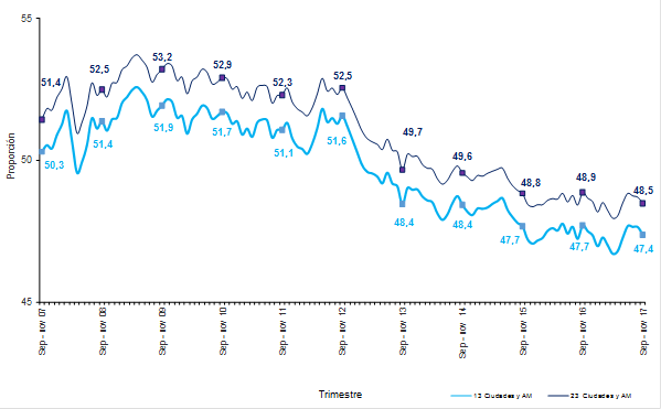 Para el trimestre móvil septiembre – noviembre 2017 el % de ocupados que cotizaba a pensión fue 51,2 % en las 13 ciudades y áreas metropolitanas y 49,8% en las 23 ciudades y áreas metropolitanas. Conozca más detalles en: http://bit.ly/1q8Qt4B  pic.twitter.com/1PExtR7Gut