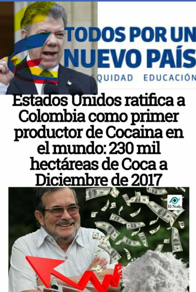 Felicitaciones Mitómano su gran logro mayor producción histórica de Cocaina en el Mundo. Producto de su ambición a un Nobel paz con impunidad donde la guerrilla sigue produciendo droga sin control eliminó aspersión por orden de FARC ese es el resultadopic.twitter.com/i3e0setdXl