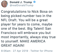 So the number one pick doesn't get a shout-out from the president? Oh that's right he likes people that come in second just like he did in 2016