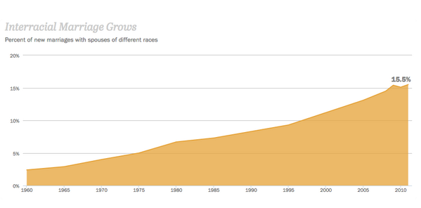 RT @JuddLegum: 15% of marriages in America are now interracial http://goo.gl/zm0CYj pic.twitter.com/SndvlfIE7R