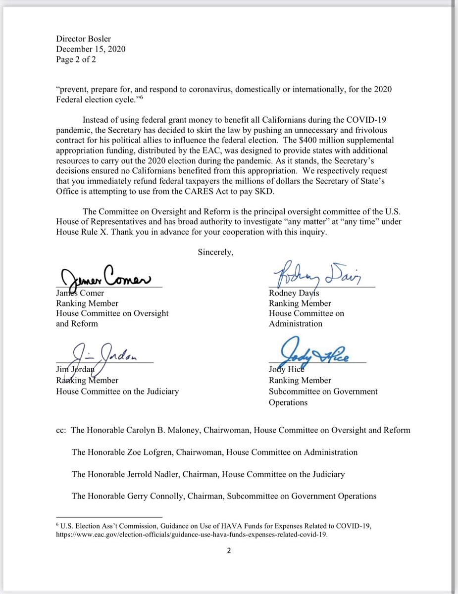 Top Republicans are demanding that the State of California return ALL federal money to @USTreasury that Sec. of State Padilla is attempting to use for an unlawful contract with a pro-Biden firm to contact voters. The $35 million contract is a violation of the law.