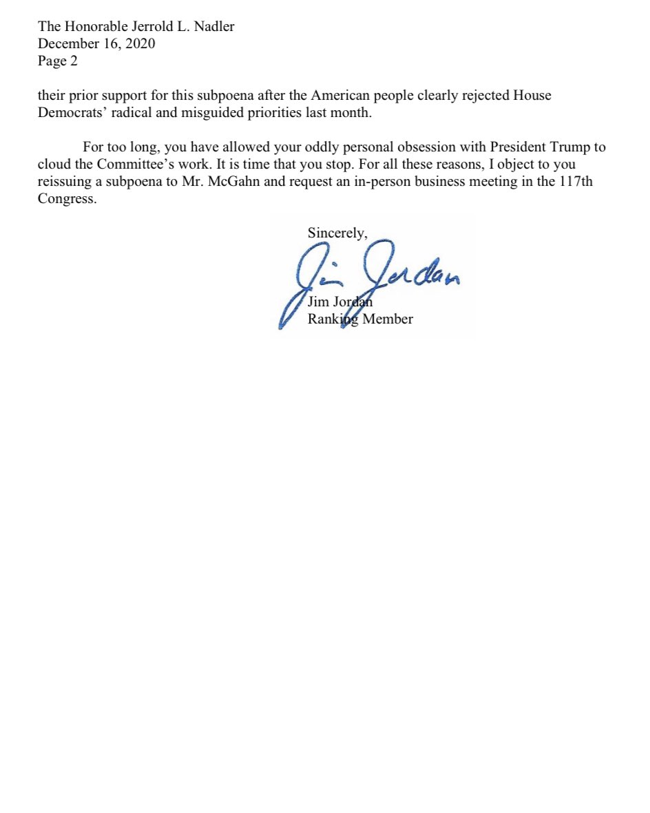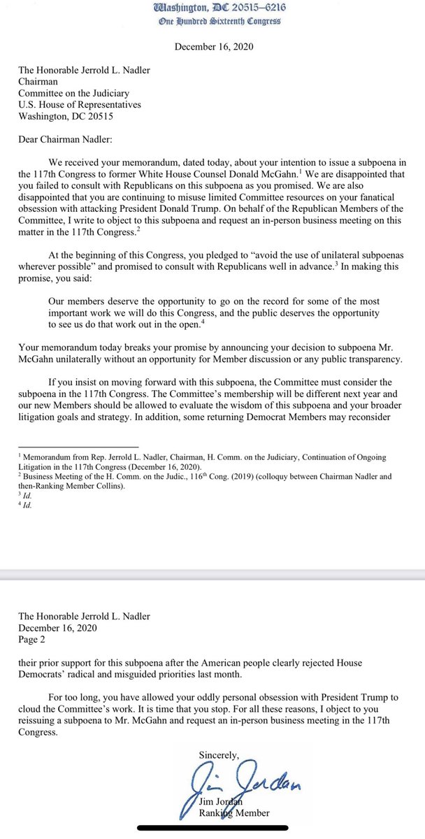 Jordan to Nadler, after assertion Nadler intends to subpoena McGahn in new Congress: You have allowed your oddly personal obsession with President Trump to cloud the Committee’s work...I object to you reissuing a subpoena to Mr. McGahn..in the 117th Congress.
