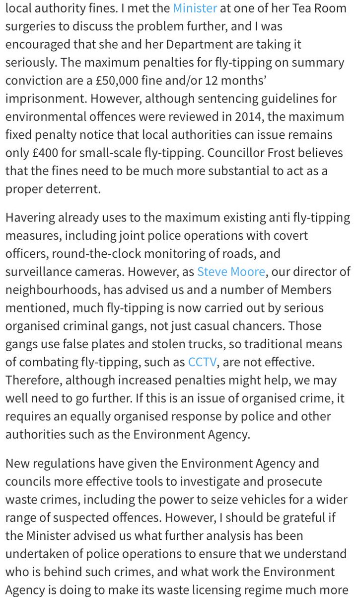 Yesterday I spoke in fly-tipping debate, setting out problem in our country lanes&my work on this with Cllr Jason Frost. Minister @theresecoffey set out range of things gov doing to tackle inc strengthening council powers and new app to help gather data and intel to assist policepic.twitter.com/jm0ltK13NM