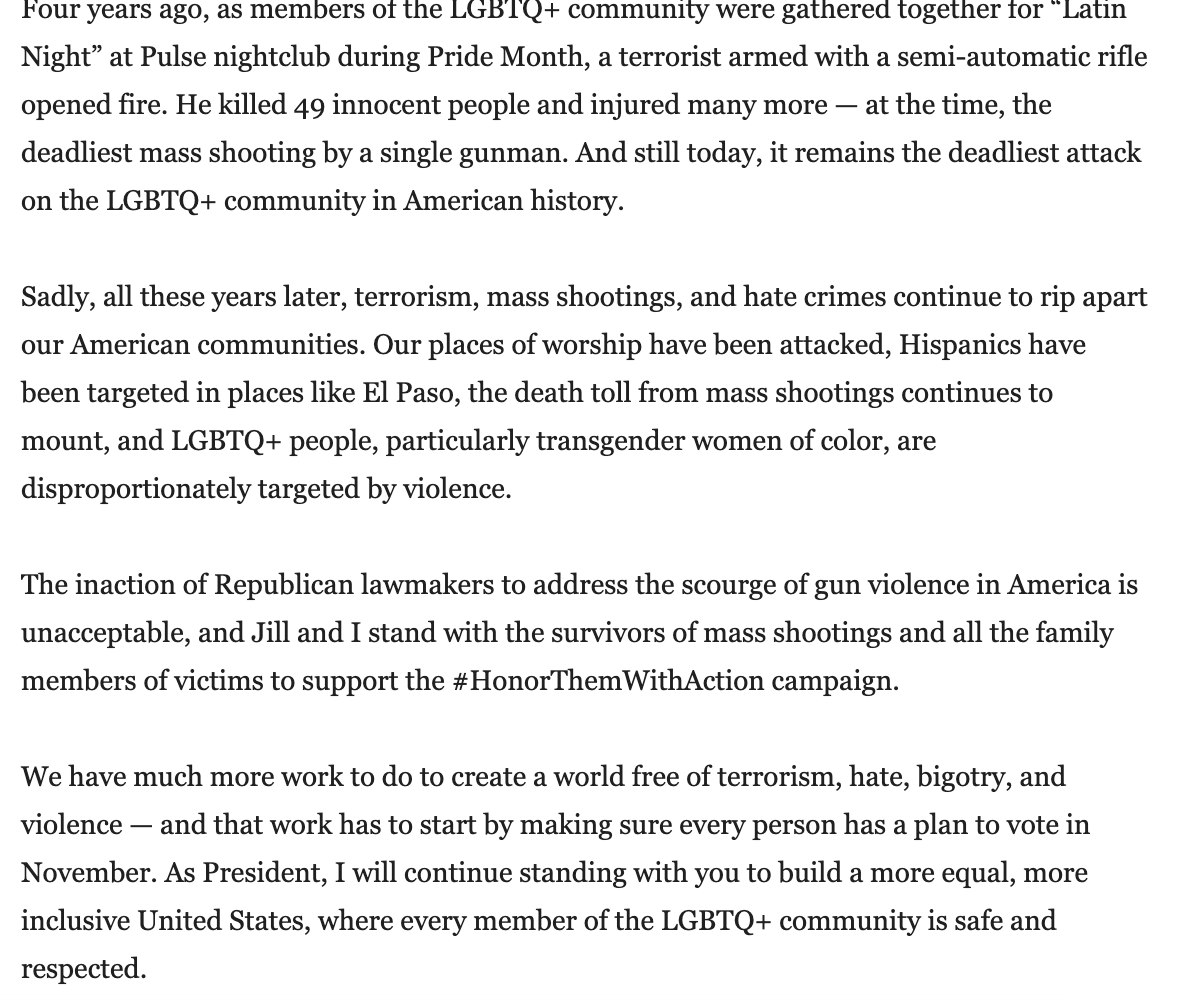 INBOX: @JoeBiden releases statement on the fourth anniversary of the Pulse Nightclub shooting in Orlandopic.twitter.com/o8ZWIm6q2e
