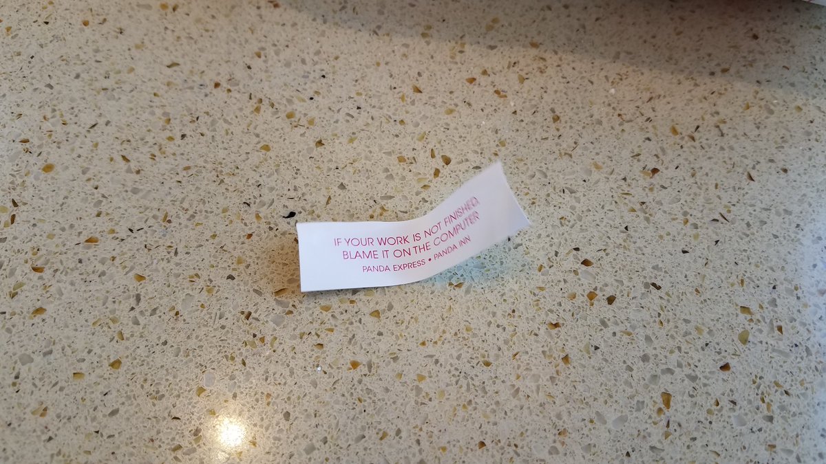 Fortune cookie: " If your work is not finished blame it on the computer " Me: lagfpic.twitter.com/nMunut5osi