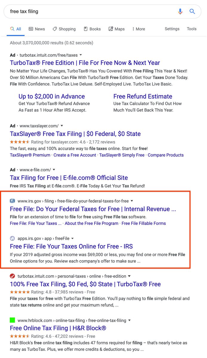 Thanks. That was a chrome search fwiw. Does Google have a policy on misleading ads? Many of these ads touting "free" end up not being free. https://www.propublica.org/article/turbotax-just-tricked-you-into-paying-to-file-your-taxes … There's litigation and investigations going on around this right now, eghttps://www.npr.org/2019/05/07/720941665/la-city-attorney-sues-intuit-and-h-r-block-alleging-they-undermine-free-tax-fili …