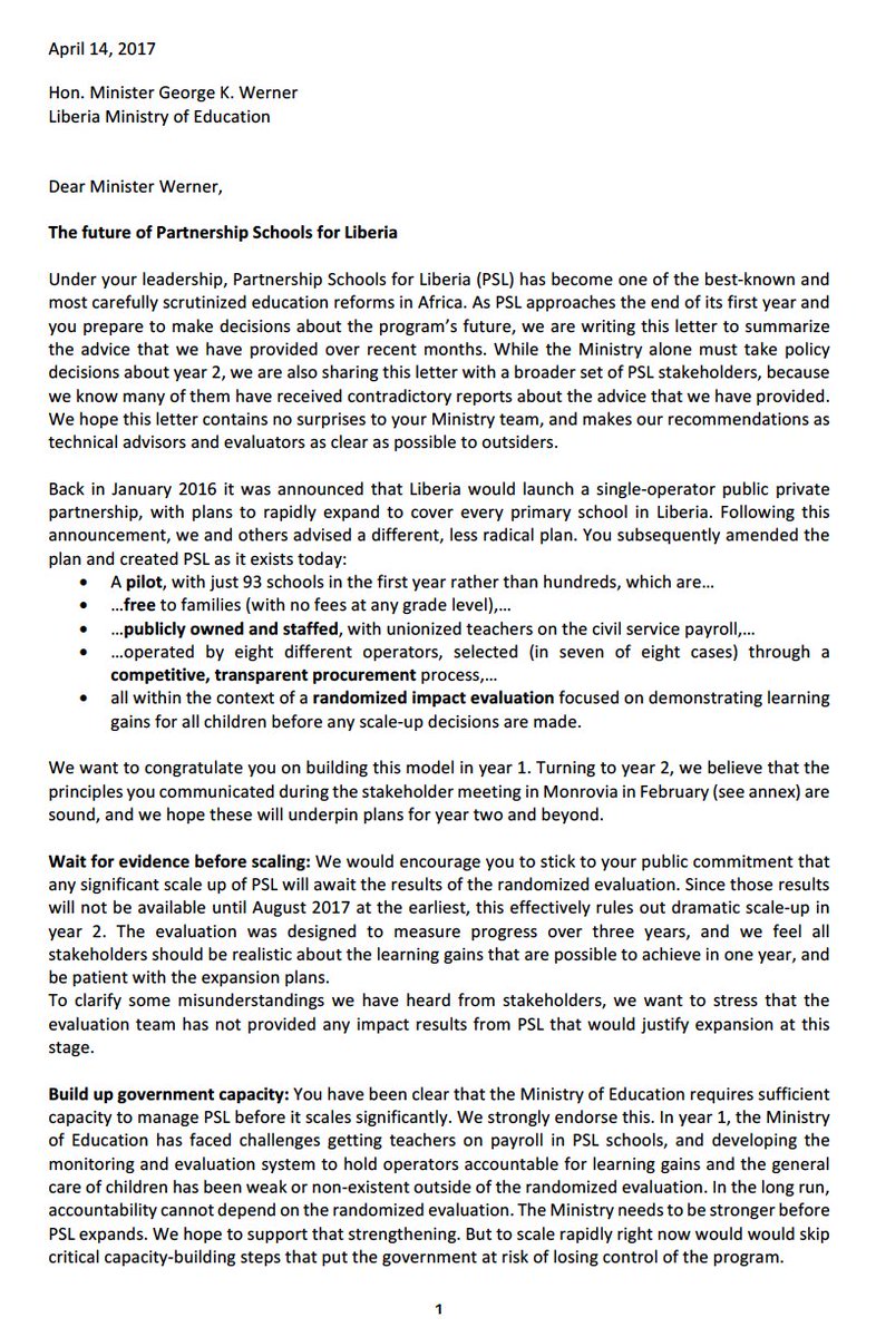 An open letter re Liberia's Partnership Schools Highlights 1. Next year too soon to scale (no evidence, no capacity) 2. Monopolies are badpic.twitter.com/4C9AmUkQNh