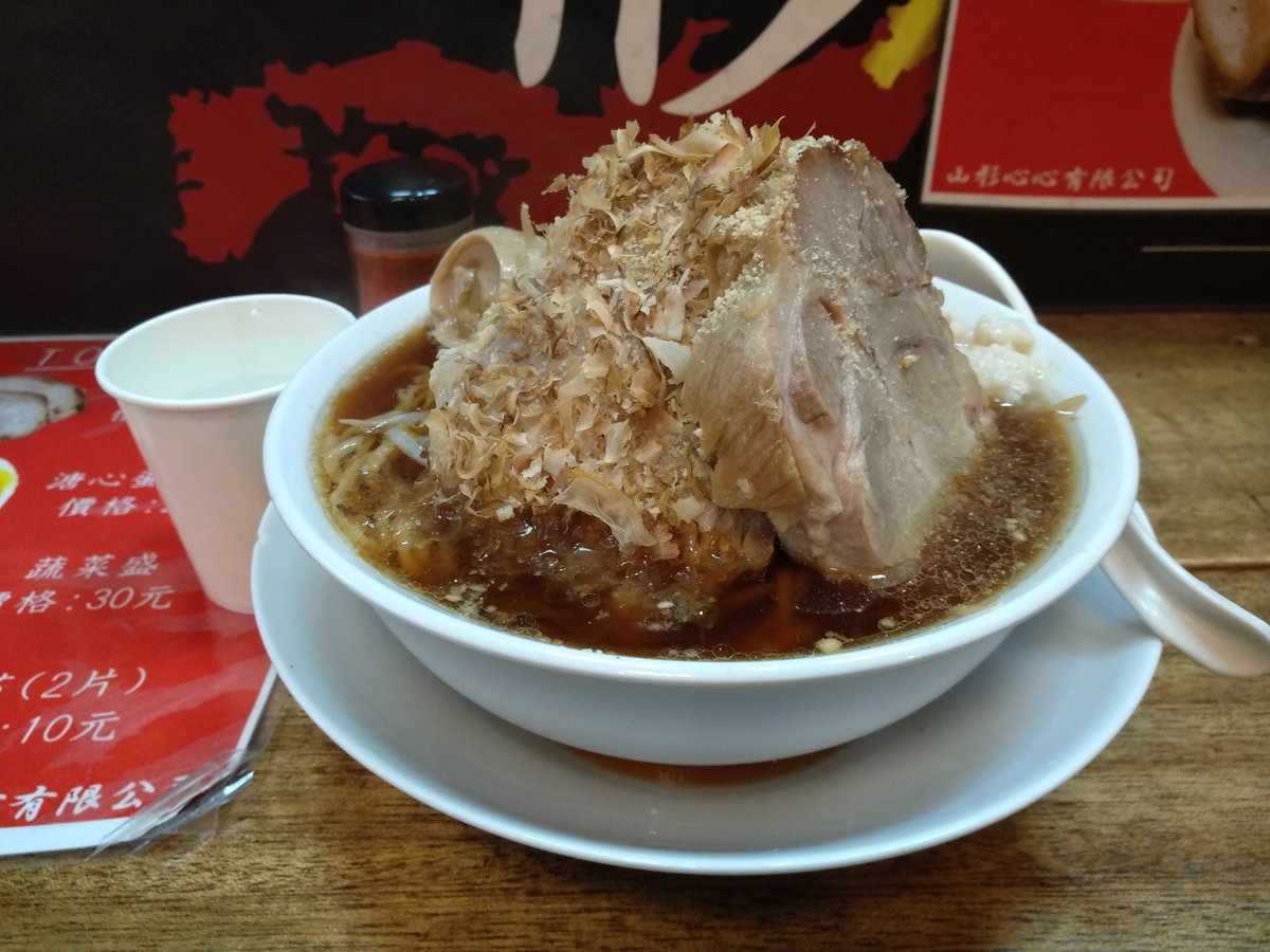 凶悪な量の肉塊は柔らかく贅沢なハムを丸かじりしているような多幸感がある。麺は二郎より細めなぶんでろっとせず食べやすい。個人的にはニンニクをマシマシにしたほうがパンチが増えるかも。台湾侮りがたし。以上レポっす。