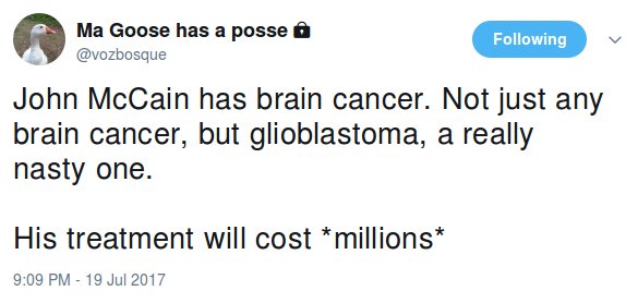 If the tumor kills McCain then it will take on his nickname of mavarick and get to cast his vote in the senate.