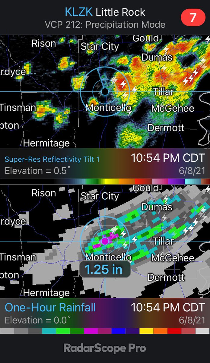 A Flash Flood Warning issued for parts of the LR Metro and Lonoke and Prairie counties to the east effective until 9:30pm. Storms could produce 1-3” of rain in some of these areas in a short amount of time