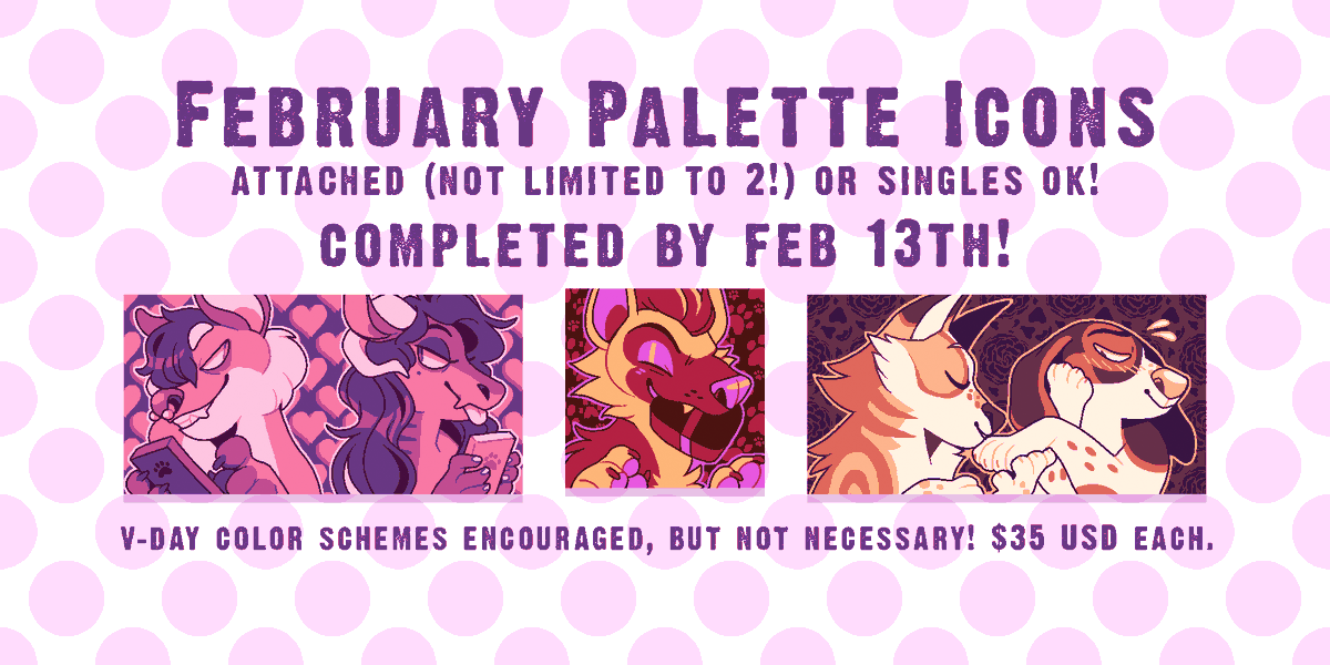 I'm accepting slots for February palette icons! There will be a much shorter window for slots this month, as I aim to finish all icons before Valentines day (and I'll be traveling at the end of the month). FORM >> https://docs.google.com/forms/d/e/1FAIpQLSd2g2S1ypRa01PwRJFrlGHnLtubbfLrKVBhwLMFmE6eci-jgw/viewform … <<pic.twitter.com/X5CpesPbzA