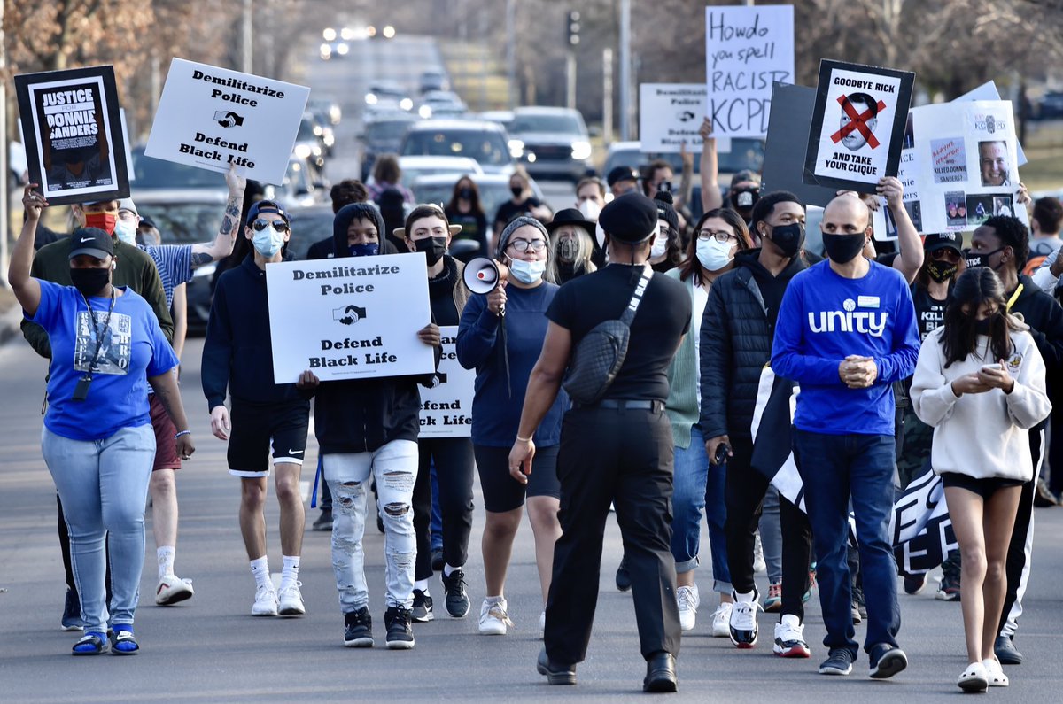 Justice for Donnie Sanders march heads north on Ward Parkway, back to Arno Park.