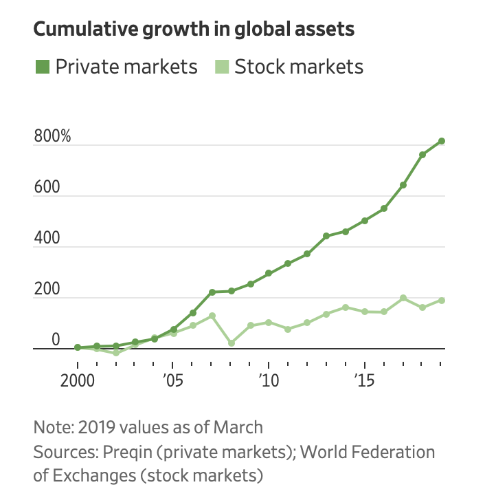 'Private markets including the $4.1 trillion in private equity have soared ninefold since 2000 to $6.73 trillion, growing three times as fast as global public equities.' https://www.wsj.com/articles/investors-urge-private-equity-industry-to-improve-transparency-11578409754 … ht