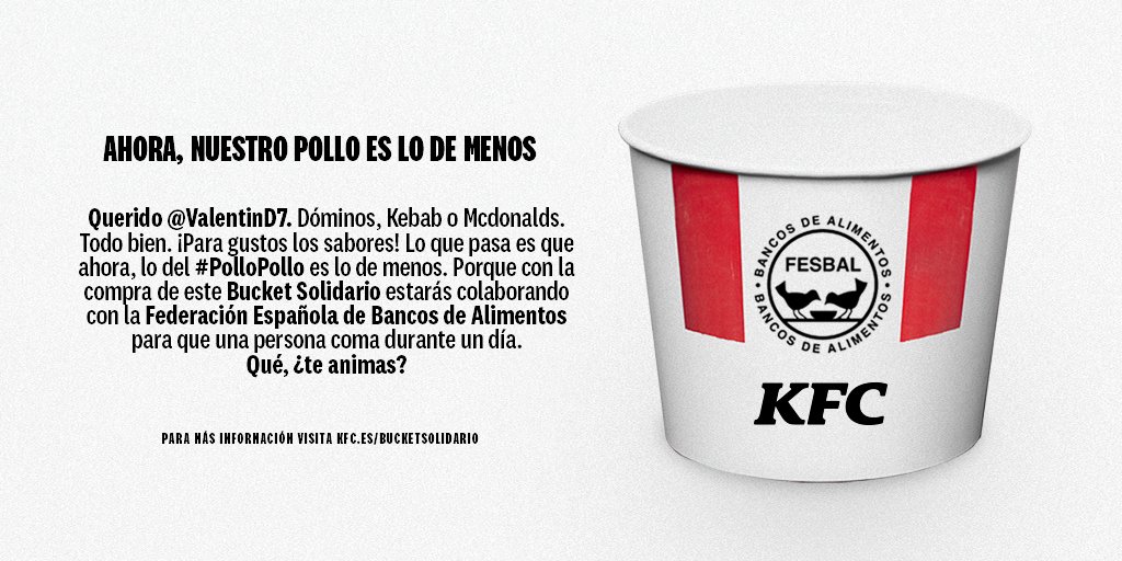 @ValentinD7. No dejes de pedirte un Kebab o un Big Mac, pero échale un vistazo a esto. #BucketSolidarioKFCpic.twitter.com/jPR4QQy157