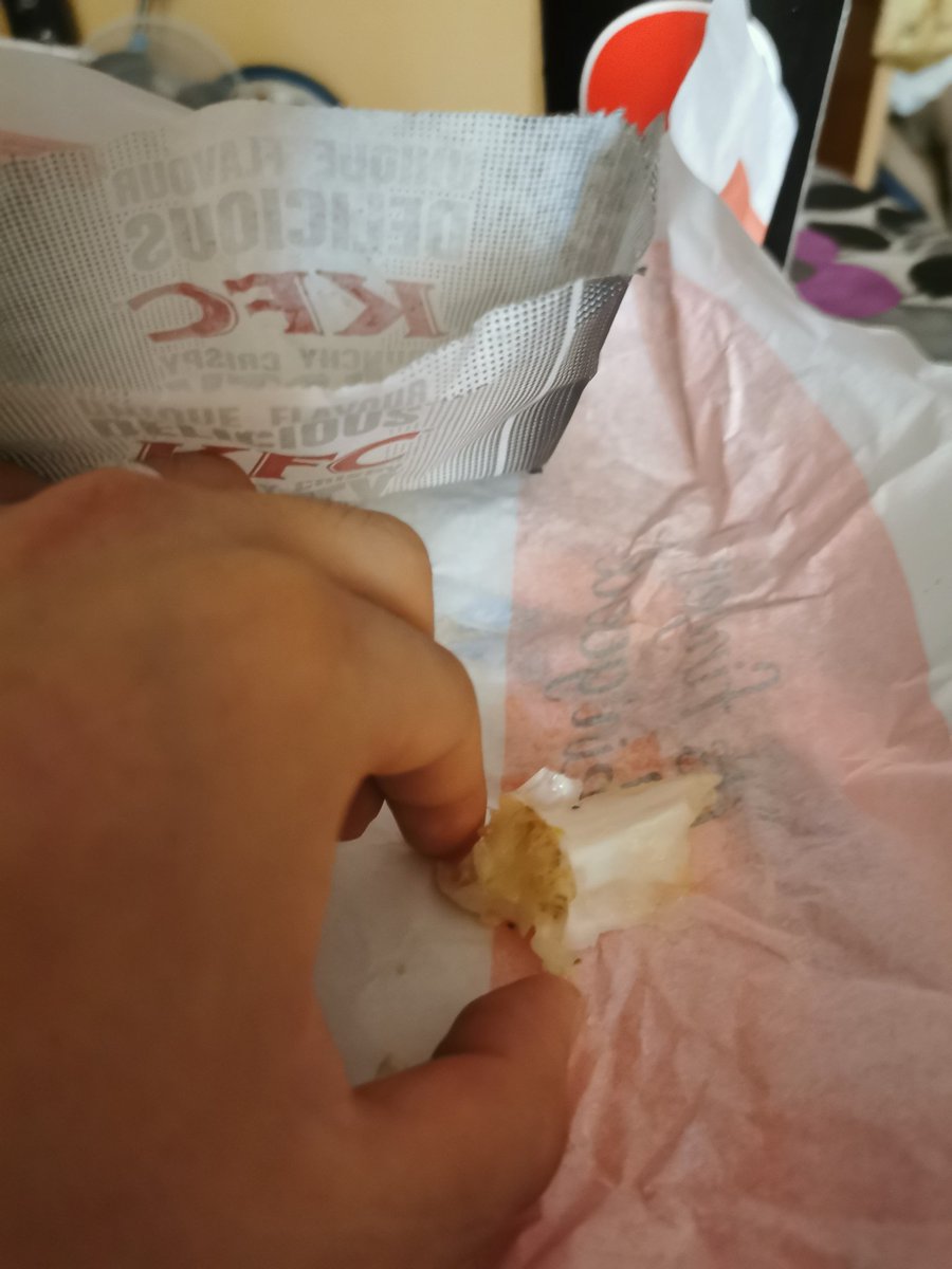 @KFC_ES Esto es lo que me encuentro en un menú wrap de un establecimiento vuestro en Sevilla. Creo que hay que estar un poco mas atento o atenta a la hora de servir la comida a vuestros clientes. Y precisamente el trozo no era pequeño..pic.twitter.com/WgmKi0uS4n