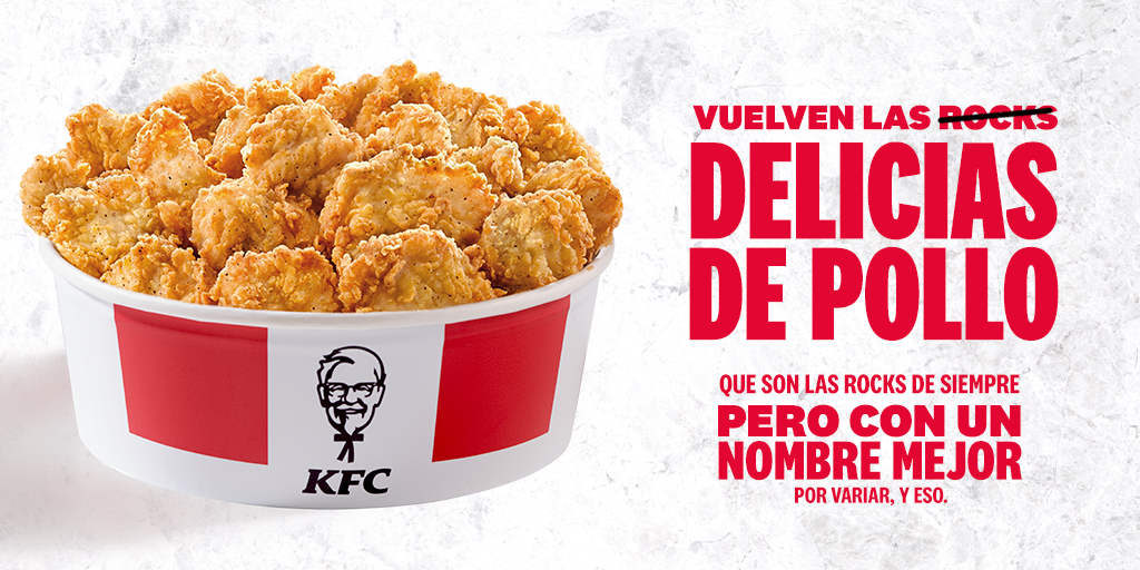 ¡Vuelven los Rocks a KFC! Y ahora se llaman Delicias de Pollo, no Rocks. Saben igual pero se llaman distinto. Ven a KFC, y pídelas así, que para eso hemos cambiado el nombre.pic.twitter.com/fIHuG64dbO