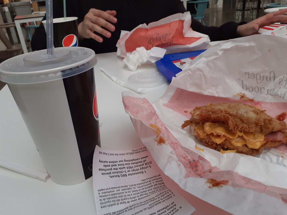 Aquí probando la Infame con mi compa @AgenjoAndres. Por favor, háganos dignos de su aprobación @KFC_ES.