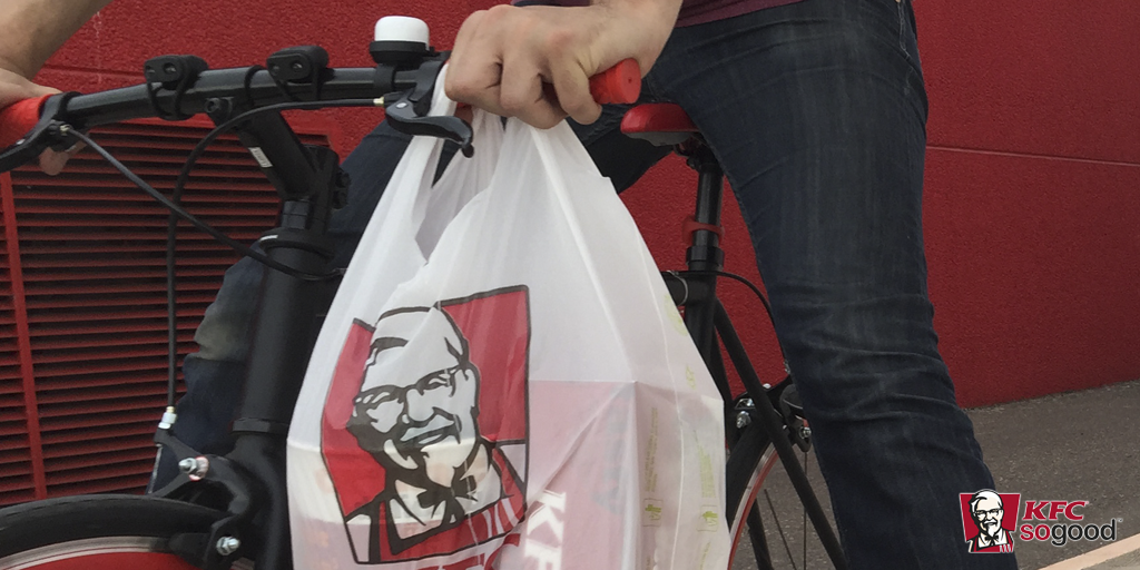 Prueba algo diferente: vente a KFC en bici, en patines, a pie ¡o bailando! Pero ven. ;) #DíaSinCochespic.twitter.com/sIKpLoYma7