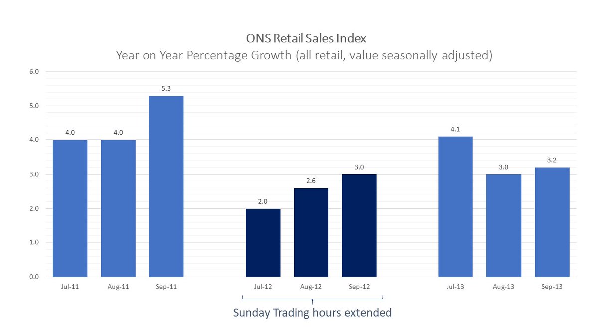 Those in favour of extending Sunday Trading rules point to a '3.2% sales increase' during 2012 when shops opened longer during the Olympics, but provide no source. The truth is, according to the ONS, Y-o-Y sales growth was weaker in summer 2012 than both 2011 and 2013.pic.twitter.com/5PIjBCjhO5