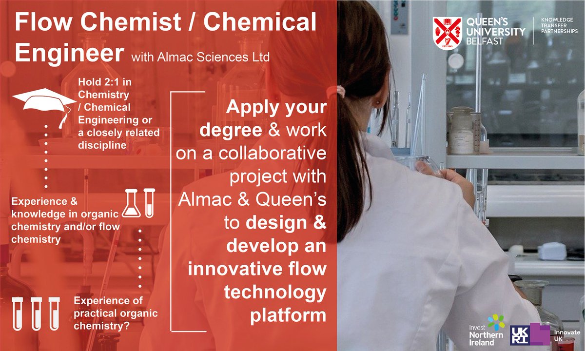 Chemistry & Chem Engineering grads-We have a #KTP role for you with the highly sought after@AlmacGroup!Want to work on a collaborative project alongside@QUBelfast academics & the company to develop a flow technology platform? Apply here: https://bit.ly/30er1o2#graduatespic.twitter.com/eBgjABqCAA