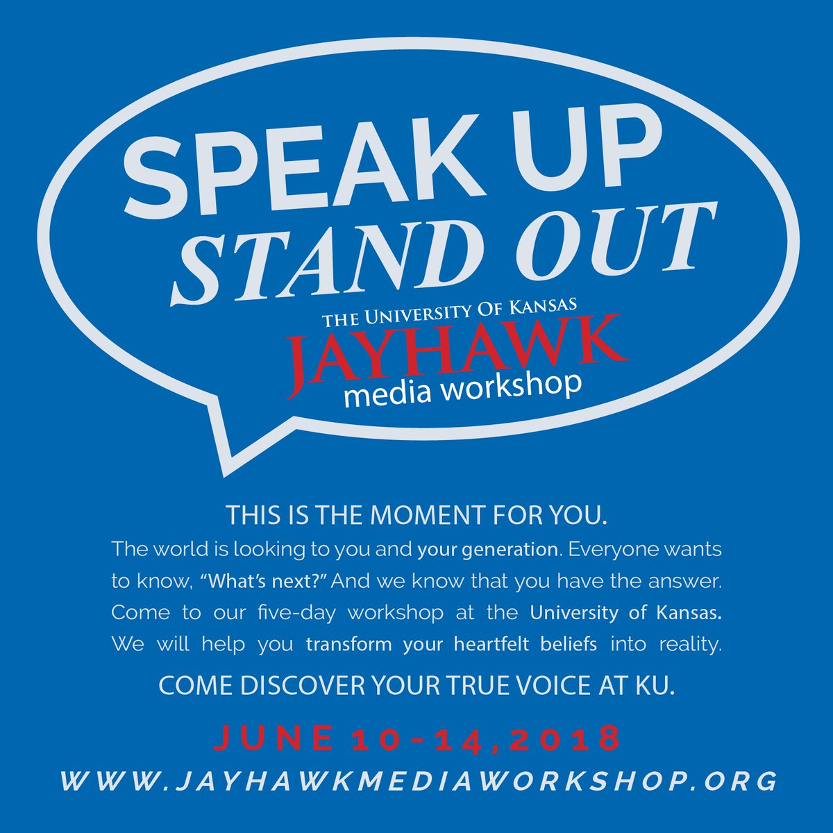 STAND UP, SPEAK OUT! KU is hosting its 54th annual high school journalism workshop from June 10-14, 2018 on the KU campus in Lawrence. Learn from professional journalists and meet students from around the country. We want YOU to raise your voices! http://ow.ly/HePB30jim2a pic.twitter.com/1tucGO84jF