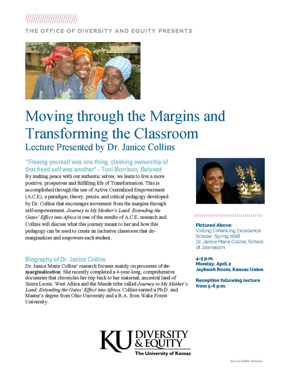 Today is the day! Join the Office of Diversity and Equity at 4:00 pm in the Jayhawk Room of the Kansas Union for Visiting Enhancing Excellence Scholar Janice Collins' lecture. Be sure to stay for the reception afterwards, too! (Hint: there will be food!)