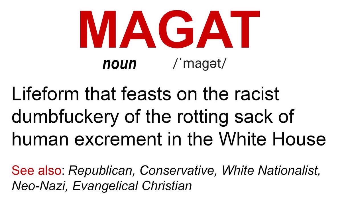 And the thesaurus version: MAGAT: racist, Nazi, dickhead, bastard, confederate, trumpflake, homophobe, sexist, pig, rat, douche, wanker, useless, incel, dumbass misogynist, circus peanut, kkk, extremist, hannity