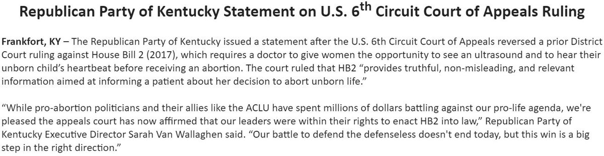 The U.S. 6th Circuit Court of Appeals has reversed a lower court ruling - meaning Kentucky's pro-life ultrasound law is upheld. This is an important step for the #prolife movement. Here's our full statement:pic.twitter.com/tPaWU5RH1X