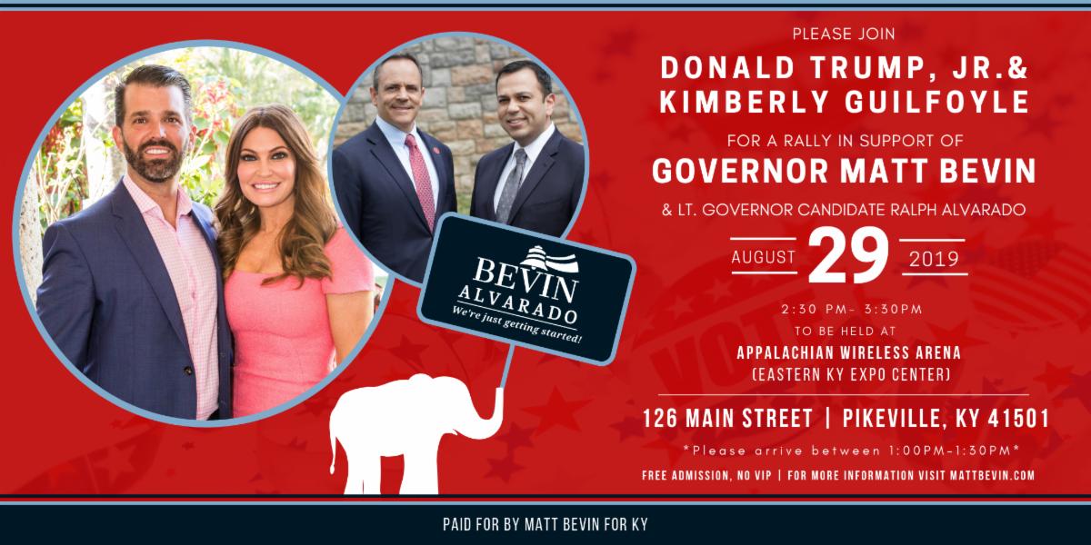 Did you see the big news? @DonaldJTrumpJr & @kimguilfoyle are coming back to Kentucky to rally with Gov. @MattBevin in Pikeville this Thursday! Sign-up today to get your tickets! https://bit.ly/2MCN7N2 pic.twitter.com/LRm9D70Oax