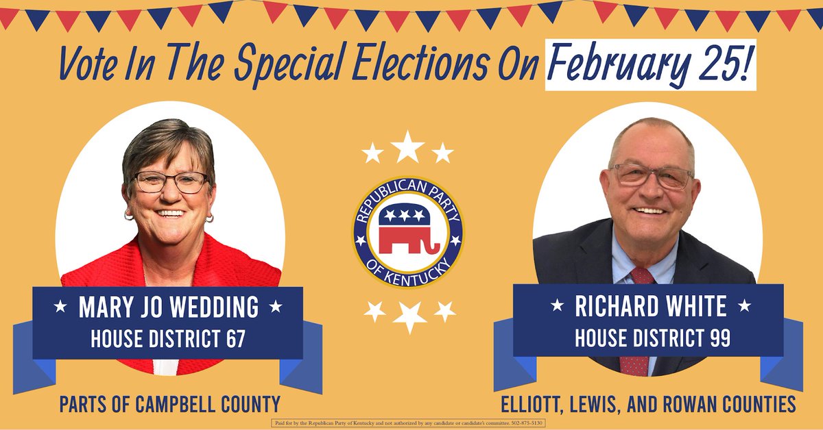 TOMORROW'S THE BIG DAY! If you live in House Distrits 67 or 99 make sure you find your polling location at http://www.gotv.gop/ky  and get out to vote for Mary Jo Wedding or Richard White in the Special Election!pic.twitter.com/yBX6kSK8rR