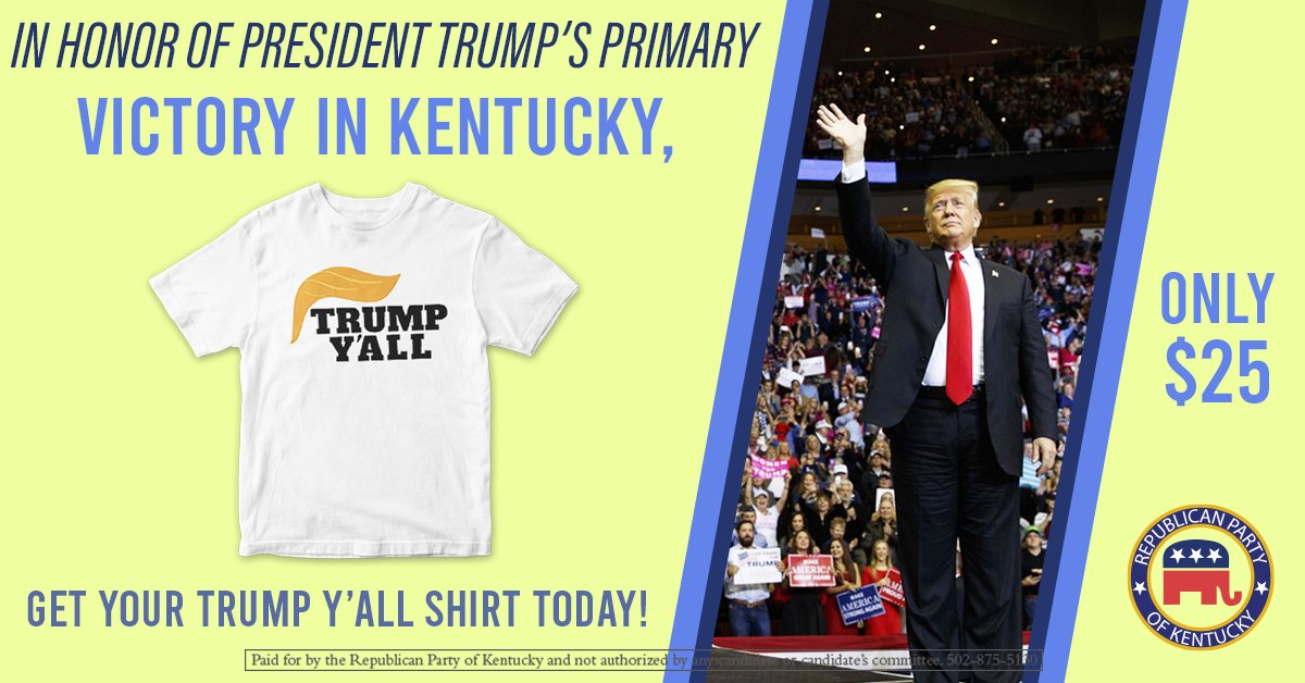 ICYMI: Yesterday we launched our "Trump Y'all" t-shirt in honor of President Trump's Primary Election victory! Gear up for November with our Trump Y'all t-shirt for just $25 -> https://republican-party-of-kentucky.revv.co/storefront/trump-y-all-t-shirt/details …pic.twitter.com/zeDbYupKFR