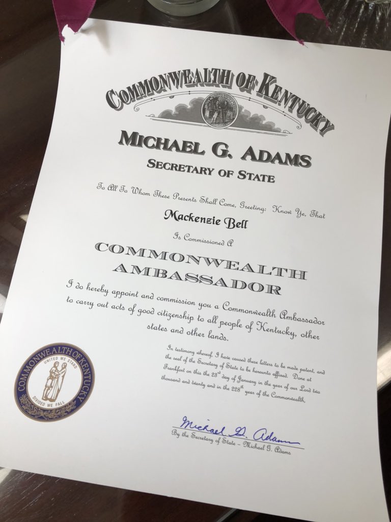 I have the distinct honor of issuing my first Commonwealth Ambassador Award. The Secretary of State presents this award to a person who has demonstrated exceptional character through his or her contributions to KY. Congratulations, Mackenzie Bell.pic.twitter.com/IbPjOwHDQj
